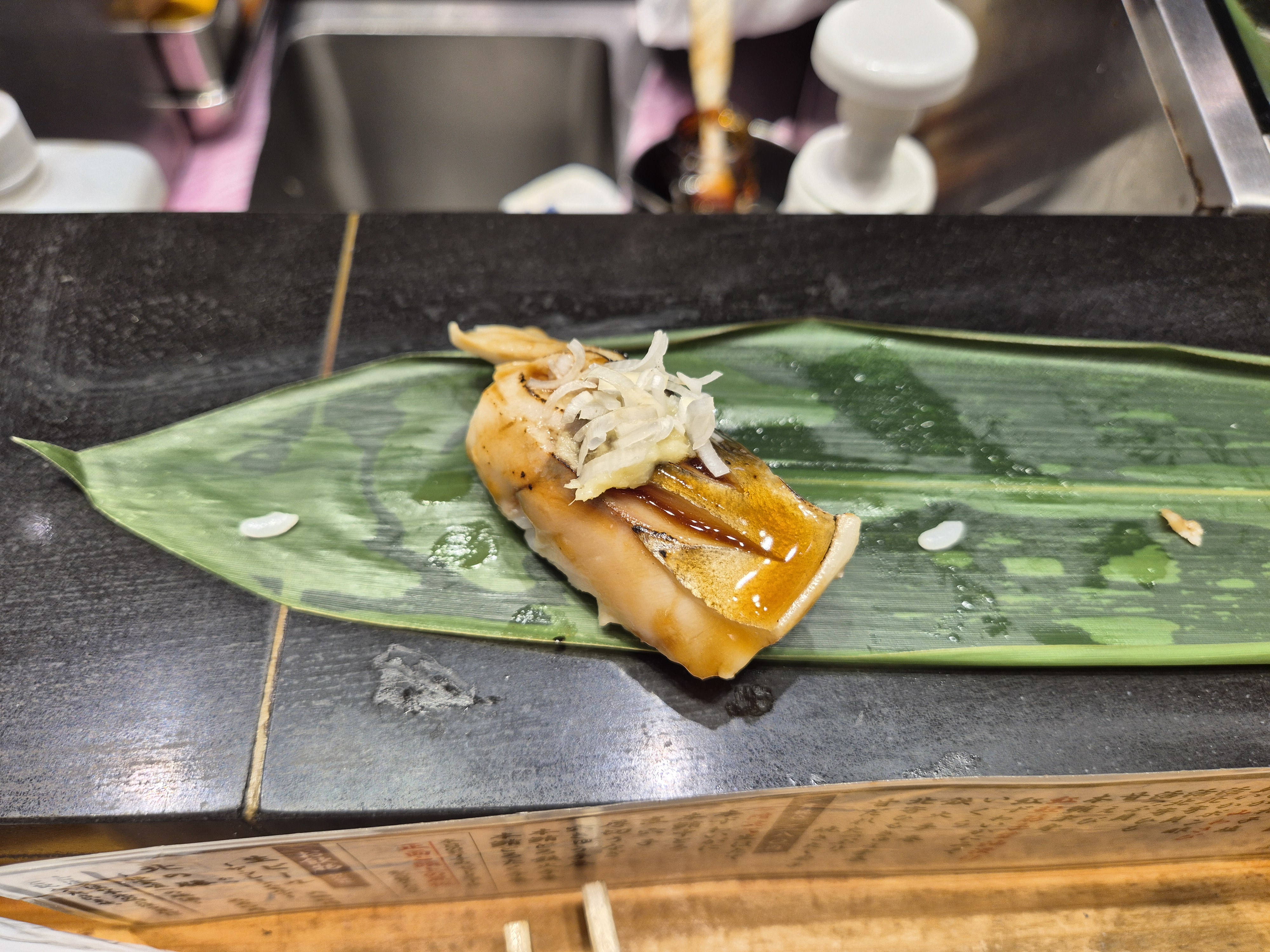 대나무 잎(?) 같은 것을 깔아주시고, 그 위에 초밥을 만들어 얹어주시는데,